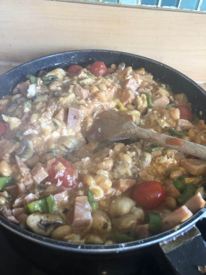 It’s basically a tin of beans, a tin of ham, some mushrooms, baby plum tomatoes and two chopped peppers heated up in a pan together. I then stirred through three eggs and let them scramble in the mix and yes, I know it probably sounds awful and most definitely looks awful but it tasted amazing and was so filling. Mr Frugal shared it with me and there was plenty to share between us with some leftover!