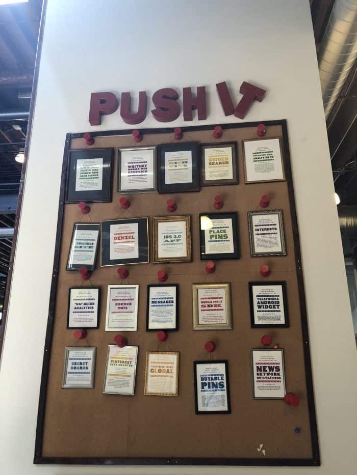 There’s also a huge pinboard which is for the guys who work at Pinterest to share their success when a big change is rolled out. Basically, the team who are responsible for the change get to ‘pin’ their achievement on the wall to the tune of Salt and Peppa’s Push It song. How cool is that?