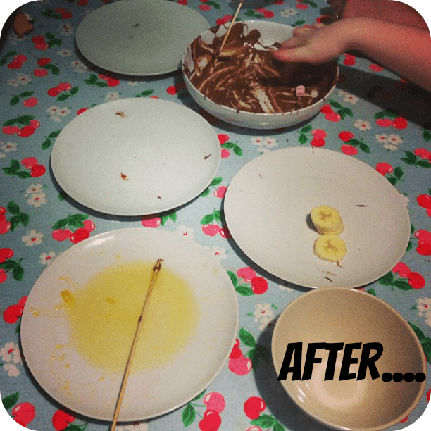 Our favourite way to use up any leftover chocolate is to melt it all together in a bowl, add some plates of chopped fruit, some marshmallows and maybe some cookies and give everyone a kebab skewer (or a fork) and away you go.